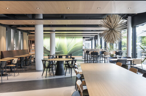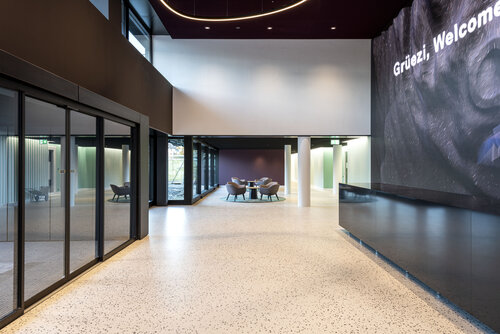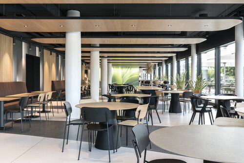 There are three meeting/seminar/dining rooms with 23, 43 and 51 square meters respectively, available on the ground floor. The smaller private meeting room can accommodate around 10 people. The conference room with an 18-seater boardroom and the seminar room can be furnished as desired. All rooms are equipped with WiFi and large screens. Lunch, snacks or a coffee buffet can be ordered through the Compass Group.